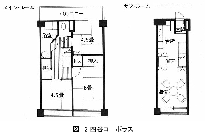 日本初の民間による個人向け分譲マンションといわれているのが1956年の日本信販が分譲した四谷コーポラス(図-2)。なんとプランはメゾネットだったのですね。月賦販売の導入やオーダーメード方式など間取り以外も画期的な商品でした。