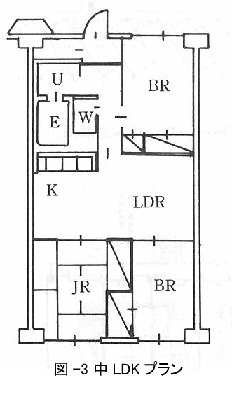 その頃の定番の3LDKといえば中央にLKDを設けた中LDKプラン(図-3)です。長谷川工務店(現長谷工コーポレーション)がコンバスシリーズという名称で標準化するなど広く普及しました。リビングの採光やキッチンの独立性が重視される現在とは異なり、当時はまだ和室が生活の中心であり、キッチンとダイニングが一体化した公営51C型をルーツとしたDKスタイルが主流ということもあり、和室の採光を重視しDKが一体化した中LDKプランが定番の間取りとなっていました。フロンテージ(間口)は5.4メートル程度でLDKには直接の採光はなく、オープンキッチンが当たり前でした。
