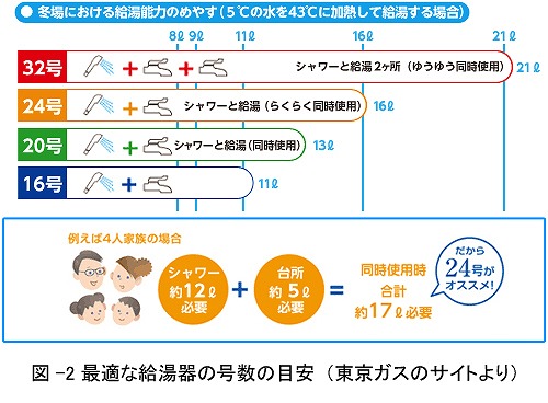 図-2は東京ガス、図-3はノーリツのサイトに掲載されている給湯器の号数の目安です。