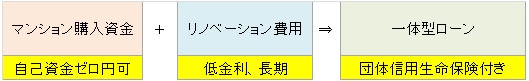 ①中古マンション購入資金にリノベーション費用を含めた一体の住宅ローンとしてお借り入れが可能です。