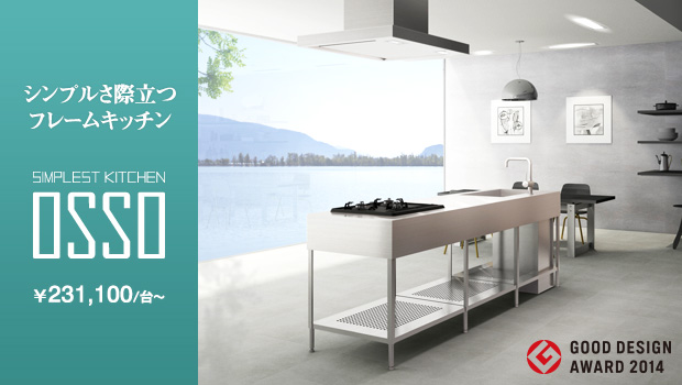 下のものは、必要最小限の機能に絞り込んだシンプルなデザインのフレーム型と呼ばれる同社のオッソというステンレンキッチンです。シンクの下以外はフレームのみのデザインとなっている軽やかでミニマルなデザインです。収納や食洗機やオーブンなどは必要に応じて組み合わせることが可能なので、自分のライフスタイルにあったシンプルなデザインのキッチンを作ることができます。