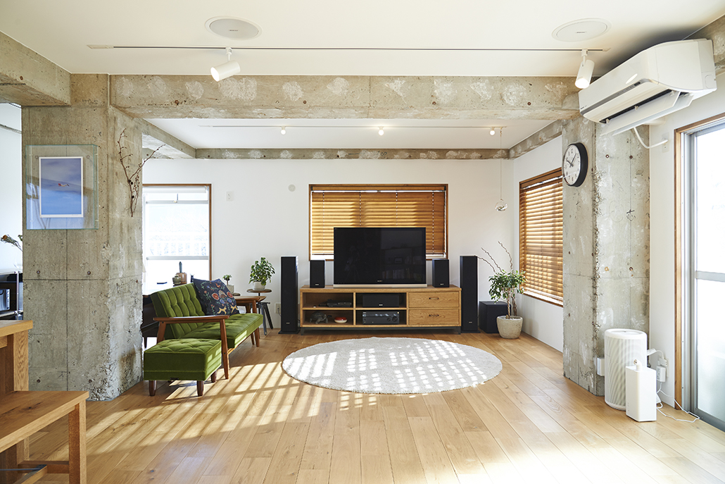コンクリートの打ちっ放しの天井と足場板を用いたフローリングが印象的なリビング。