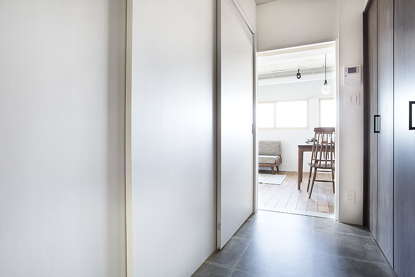 玄関ホールが部屋を圧迫することのないように、ベッドルームやリビングダイニングを仕切る壁を3枚引き込み戸に置き換えたことで、必要な時は閉めて、普段は思い切り開けて解放感も味わえるプランになりました。
