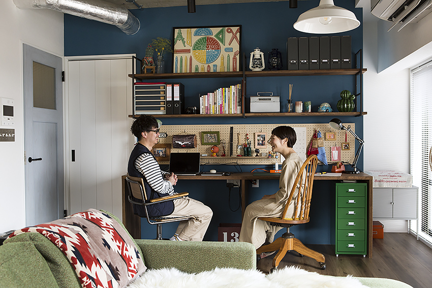 有孔ボードや造作棚を駆使して、文房具やインテリアをデコレーションしながら、見せる収納を実現しています。