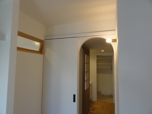 また、WICの入口は、当初アーチ型の壁で、フルオープンにする予定でしたが、それだと「お子様の声やお家の生活音が聞こえてきてしまう!」ということで、設計の最終段階で急遽アウトセット引戸をつけることに。