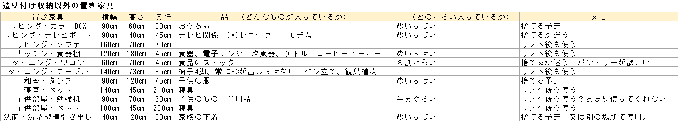 作り付けの収納以外にも置き家具は何を持っているかを把握することも大事な作業の一つです。