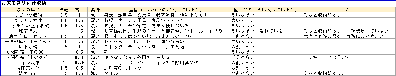 この様に家の収納量に対して、荷物の品目と荷物の量を全部書き出してみる事で、わかりやすく現状を把握出来るようになると思います。
