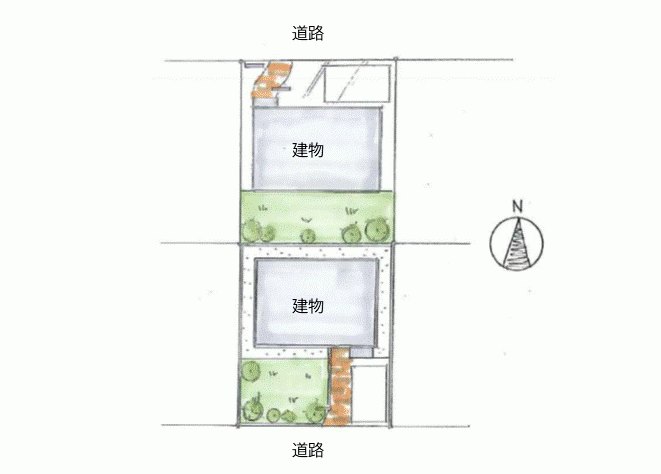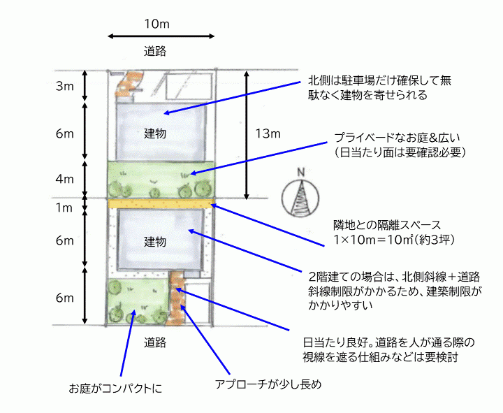 北道路付けだと、どうしても日当たりや通風がとりづらい土地がありますが、次のように日当たりが確保できるなら良いですね。
