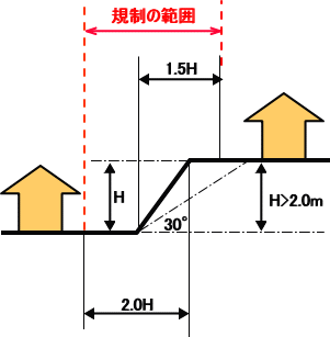 高さ2メートルを超えるがけの下端からの水平距離ががけ高の2倍以内のところに建築物を建築し、又は建築敷地を造成する場合は、高さ二メートルを超える擁壁を設けなければならない。(東京都建築安全条例第6条)