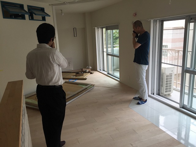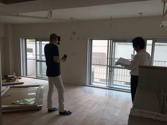 souksさんは採寸や照明位置の確認、当日の物件の状態確認などを行い、