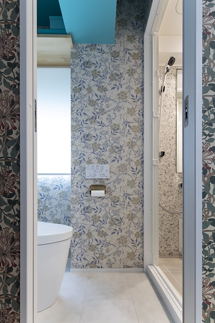 リノベーションの参考にしたのは、和菓子屋さん「舟和 本店」のインテリア。ウィリアム・モリスの壁紙やタイルの組み合わせが素敵なお店です。このお部屋にも、居室とトイレにウィリアム・モリスの壁紙をそれぞれ別のものを取り入れ、洗面台には青色の和柄タイルと白タイルの2種類をセレクト。それぞれに個性がありながら、全体としてもバランスの取れたコーディネートです。