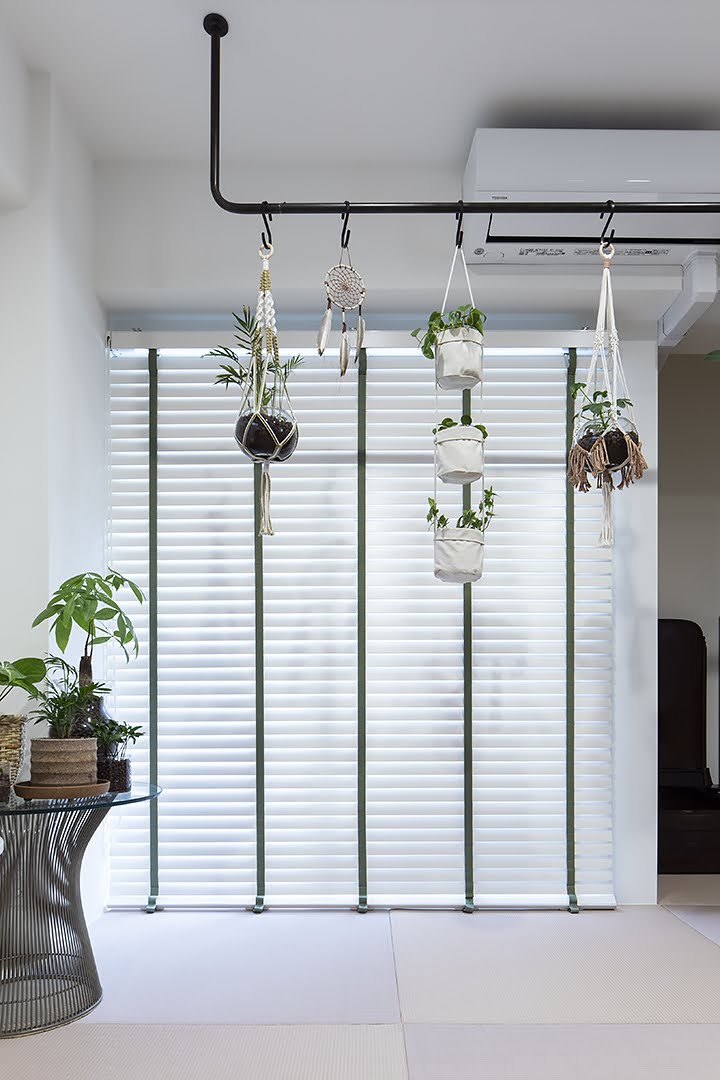 窓際は、当初からお客様のご要望だった植物を置けるスペースに。アイアンバーを設置して、グリーンをたくさん吊り下げられるようにしました。玄関にも、コートハンガーとして使えるアイアンバーを。実用的でありながら、インテリアを飾るためにも活かせます。