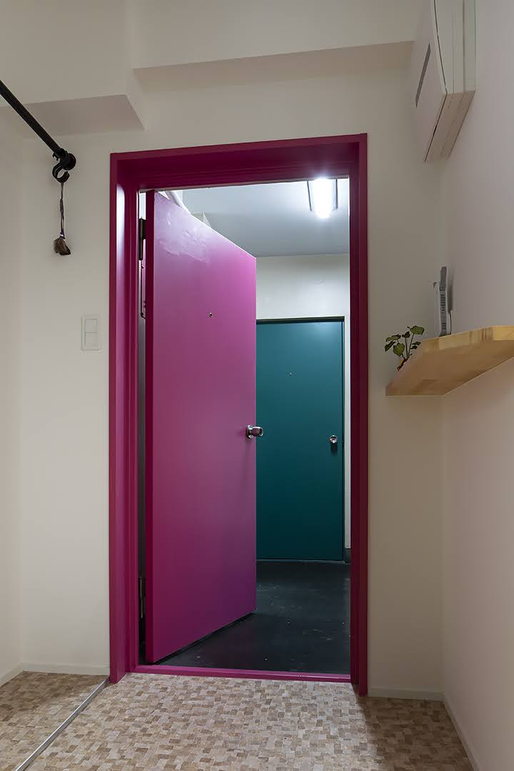 玄関ドアは、ドラえもんのどこでもドアのようなピンクをチョイス。隣のお仕事用のお部屋の玄関ドアも同時にグリーンに塗り替えました。