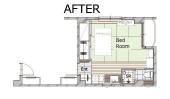 5階建ての戸建の3階部分、以前お祖母様が暮らされていたお部屋を譲り受け、リノベーションして住まわれることになりました。3階には2つお部屋がありますが、完全に独立した部屋になっており、昔はそれぞれを賃貸に出されていたこともあるそう。今はお客様が、一つをプライベート用、もう一つをリモートワーク用のお部屋として使われています。今回リノベーションしたのは、プライベート用のお部屋。リモートワークが終わったらお仕事スイッチをオフにして、身体も心も休まるお部屋が完成しました。