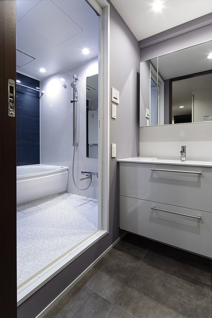 リノベーション前のユニットバスと躯体壁の間のわずかな無駄な空間を取り除き、ユニットバスを躯体壁ギリギリに設置にすることで 洗面室は10cm空間が広がりました。