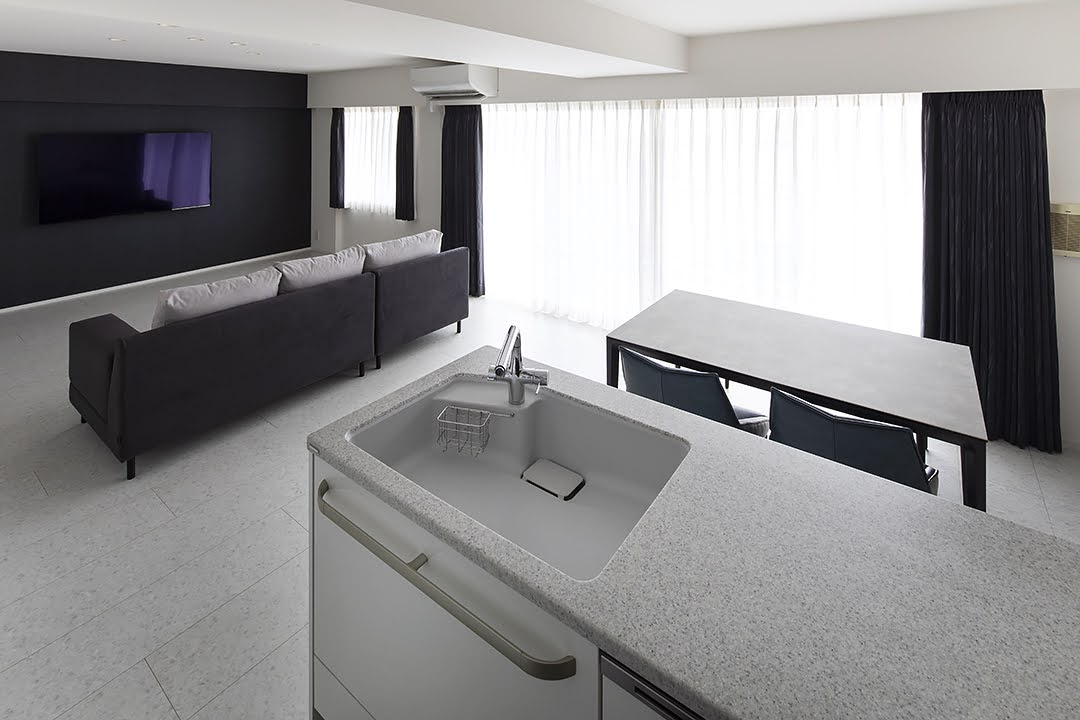 キッチンが大きくても上品な人造大理石の天板が、大理石調の床や藍色の壁タイル、ホテルライクな家具にもしっとり馴染み、見事に調和しています。キッチンからの景色もうっとりしてしまうような、壁⼀⾯の窓から差し込む光を優しく受け⽌めるカラーリングです。