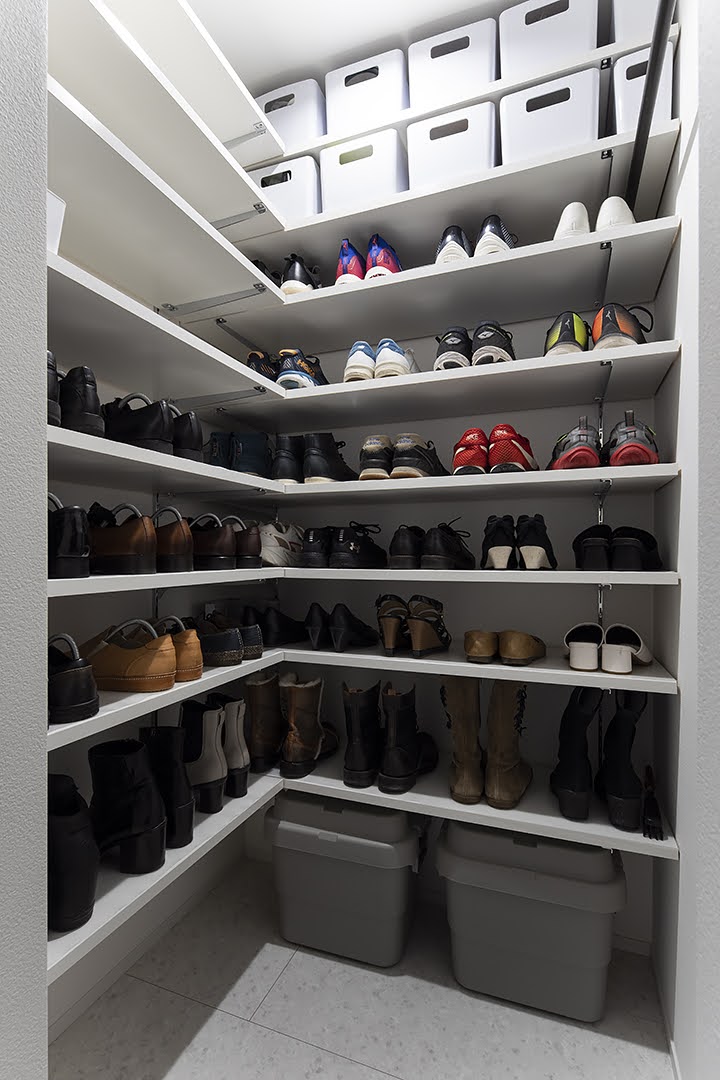 たっぷり収納できるシューズインクローゼットは、廊下側に独立させて設置しました。ランニングが趣味というご主人様こだわりのシューズも並びます。