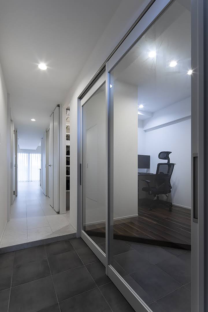 リビングからあえて遠い位置につくった“離れ”のワークスペース。ガラスの引き戸で仕切ることができ、廊下への採光を損なわずに、きちんと遮音・空調管理できる個室のワークスペースです。リビングから離れているからこそ、毎日ワークスペースへ“出勤する”感覚で、同じ家の中でも、ON/OFFの切り替えがしやすくなります。日中家で過ごされる奥様とも、お互いの音が影響しないちょうどいい距離感を保てます。「大好きなロードバイクを室内に置きたい!」という旦那様のご要望から、ワークスペースと土間を一体型にしました。旦那様お気に入りのマットな質感の黒タイルで、かっこよく仕上げています。