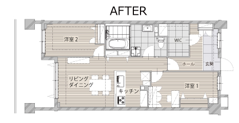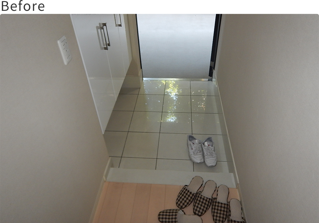 既存の3LDKから2つの個室はそのまま残し、玄関横の洋室を一部取り込んで、玄関スペースを拡大。