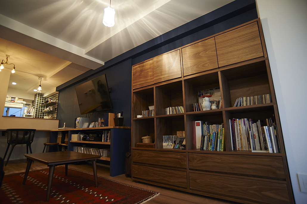ペルシャ絨毯の似合うリビングですべてのことができるようにしたいという要望をかなえるべくキッチンの前からリビングに向かって伸びるカウンターを造作。深い青色の壁と優しい木がマッチして、思わず腰かけたくなるような落ち着いた空間ができあがっています。