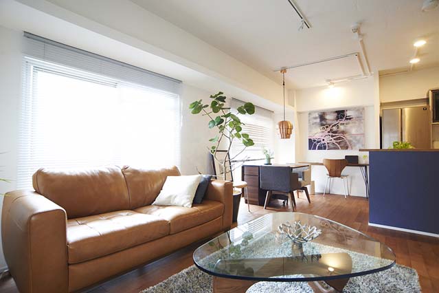 モダンな家具がマッチしているリビングに、深いブルーのオープンキッチン。