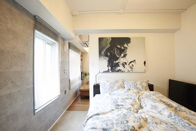 リビングから寝室にかけて、コンクリート模様の壁紙を使用。打ちっぱなし風を手軽に取り入れることができます。