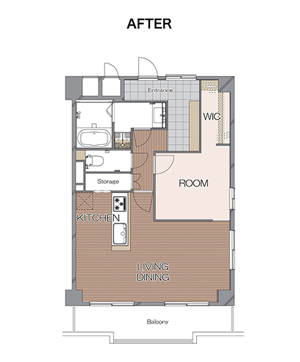 そんなお客様が最初に希望されていた間取りは1LDK+WIC、ゆくゆくはLDを2つに区切れるように、というシンプルなものでした。しかし、おふたりで55㎡に住まれるということを考え、ご自宅全体を回遊することができる動線を作り出すのはどうかとMSリノベーターからご提案。