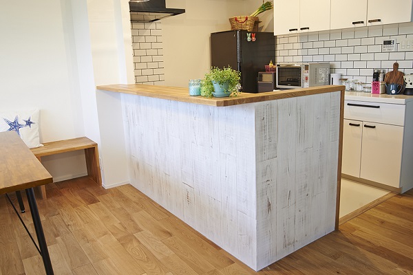 リビングでは流木のような無骨ながらも温かみのあるキッチンカウンターに目がいきます。
