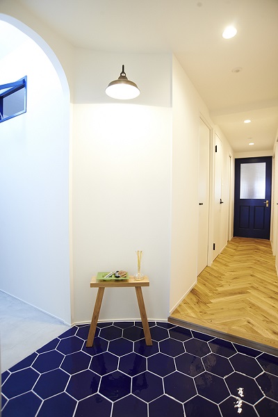 まず目に付くのは曲線を使った丸い玄関スペース。8角形の青いタイルは奥様が雑誌でみたものとおなじものをイタリアから取り寄せました。