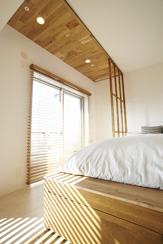 リビングのすぐお隣には寝室を。その寝室には、ベットも収納家具も置かずに済むような工夫がなされています。それは造作でつくった小上がり。