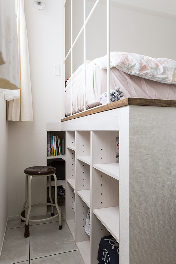 寝室をロフトのようにつくることで、たっぷりと収納スペースを確保できました。