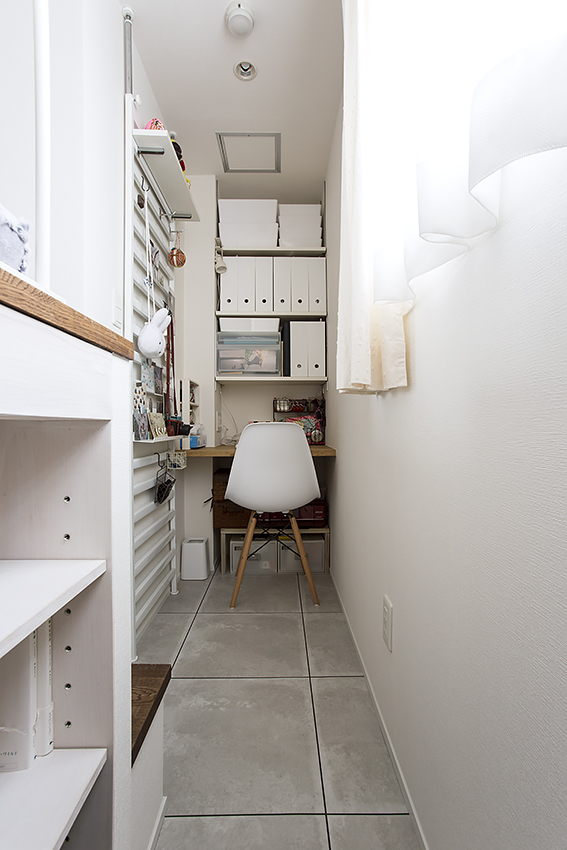 左側には書斎・本棚スペースとして、造作棚をつけることで、壁も無駄なく使っています。