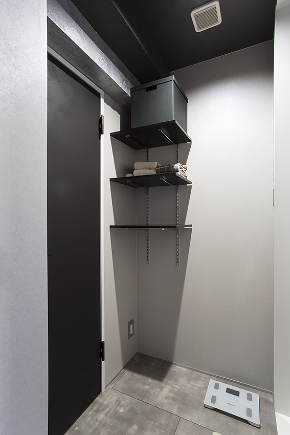天井とトイレの引き戸はマットなブラックを選び、空間を引き締めます。