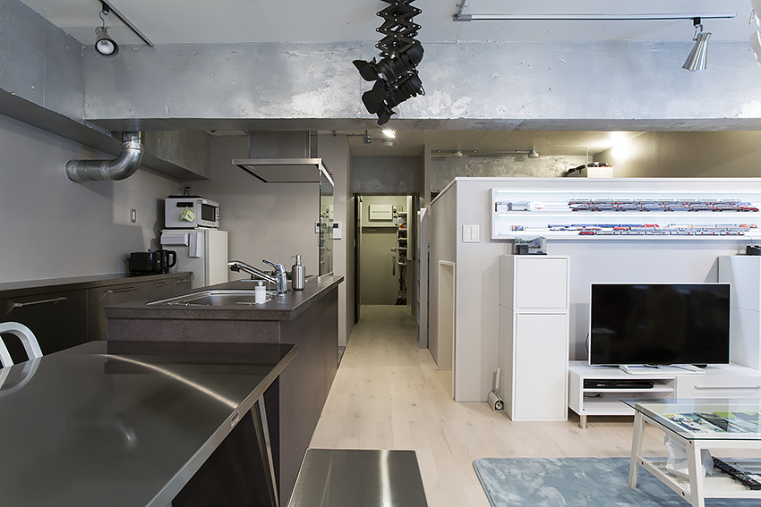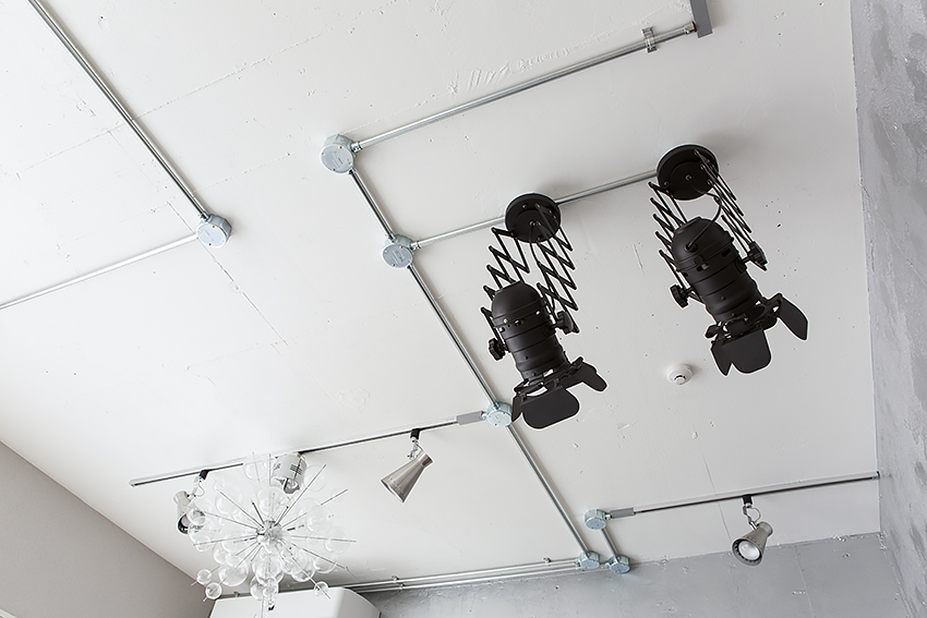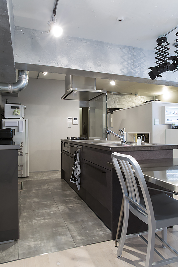 最終的には、目立つ大きなパーツ:梁や配管、ライティングレールと、細かなパーツ:巾木やスイッチ、床見切りなどにシルバー色やメタリックな素材を取り入れました。