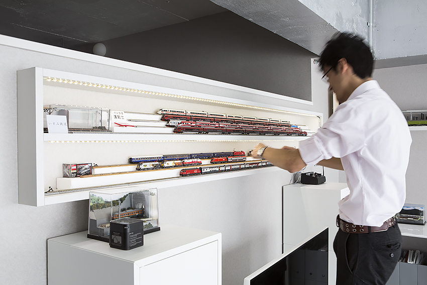 鉄道模型の直線的なデザインとショーケースのライティングが見事に近未来空間に溶け込んでいます。