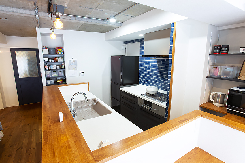 「インダストリアル感をやってみたかったけどあんまり無機質にもしたくなかったから、キッチンの天井だけコンクリートむき出しにしてみました」