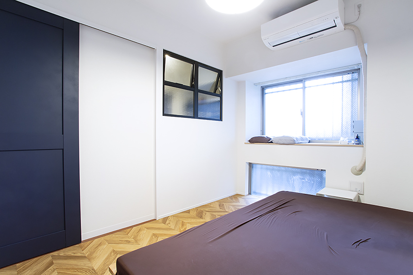 「ヘリンボーンに憧れてたんで寝室は塩ビタイルでヘリンボーン風の床にしてみました。」