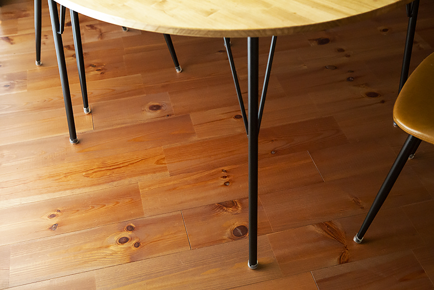 住まい全体の印象を決めるリビングの床は「白っぽくしたくない」と赤っぽい色が印象的なあづみの松のフローリングを採用。