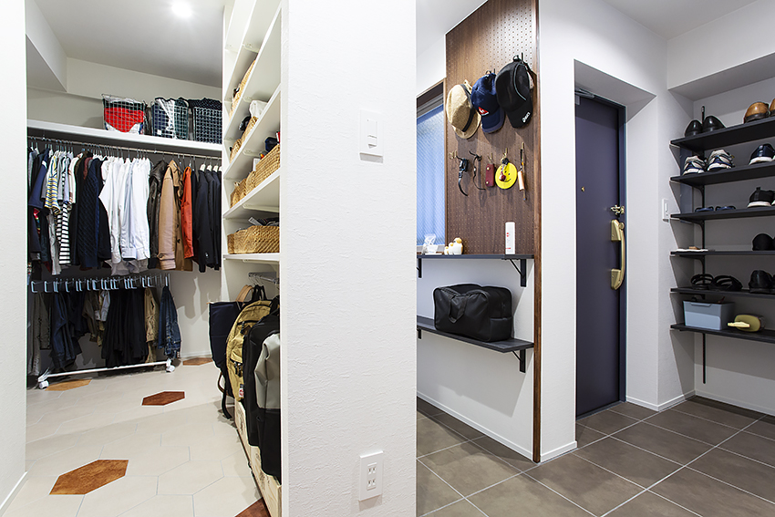 造作カウンター、可動棚、玄関土間タイル、モザイクタイル、ハンガーパイプ、有孔ボード、その他アクセサリーなど
