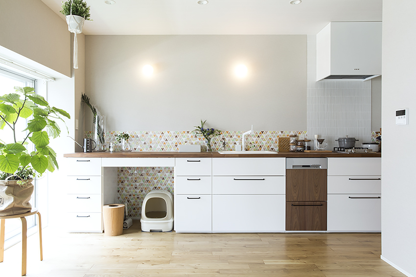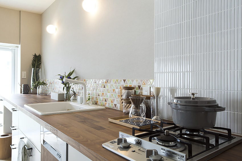 また、キッチン壁のモザイクタイルはお客様のDIYによるもの。