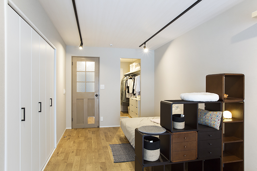 このお住まいでの解決方法は、ベッド近くにWICの入り口をつくること。