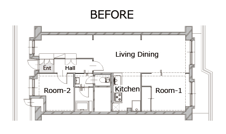 このバスルーム、元々は脱衣所からお風呂とトイレへ出入りできる、それぞれが独立した間取りになっていました。