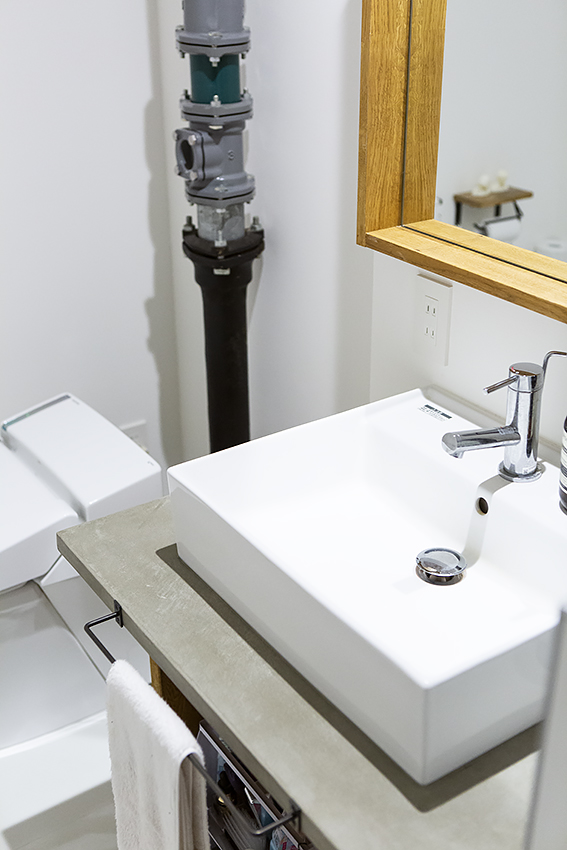 トイレの後ろのパイプや、洗面台のモルタルのカウンターなど、ディティールまで手を抜きません。