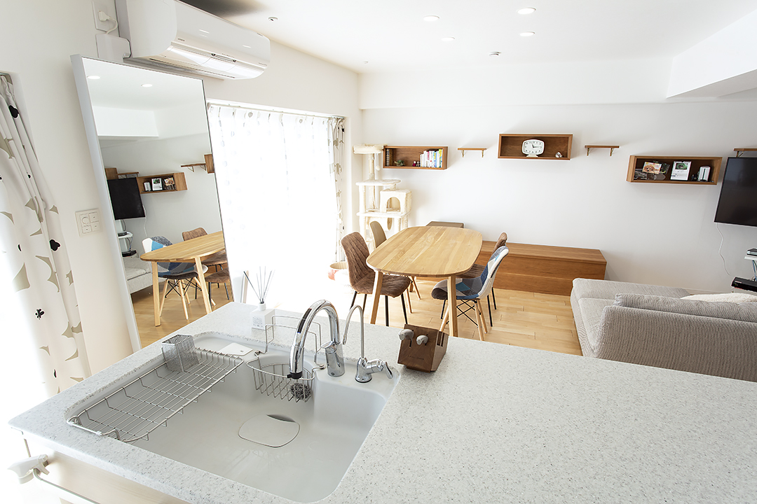このお住まいは、購入時にはすでにリフォーム済のマンションだったので、キッチンは綺麗な状態のものがついていましたが、元のキッチンはカウンターが高めで、お料理をしている手元がダイニング側からはみえないような仕様だったため、思い切って交換。