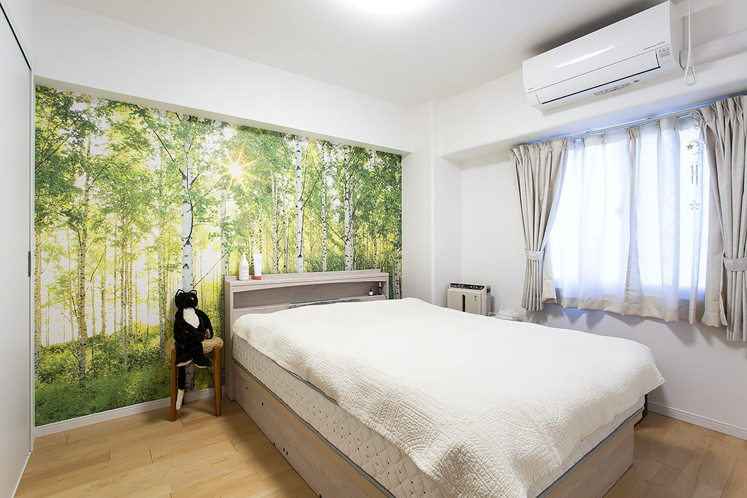 寝室はリラックスできるように、森林のクロスを選びました。