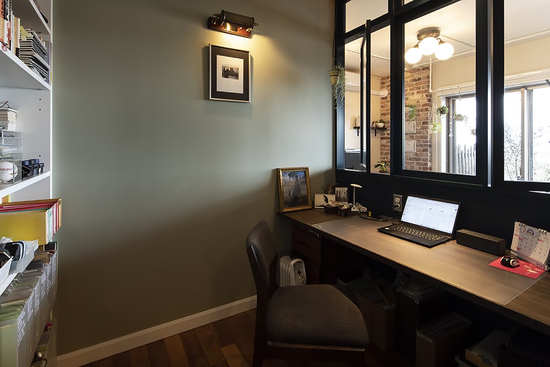 旦那様のワークスペースは、リビングと室内窓越しにつながったお部屋。バルコニーの外の景色も眺められる開放的な空間です。旦那様の好きなオリーブ色の壁で、海外の図書館にあるような印象的な照明のアクセントが効いています。