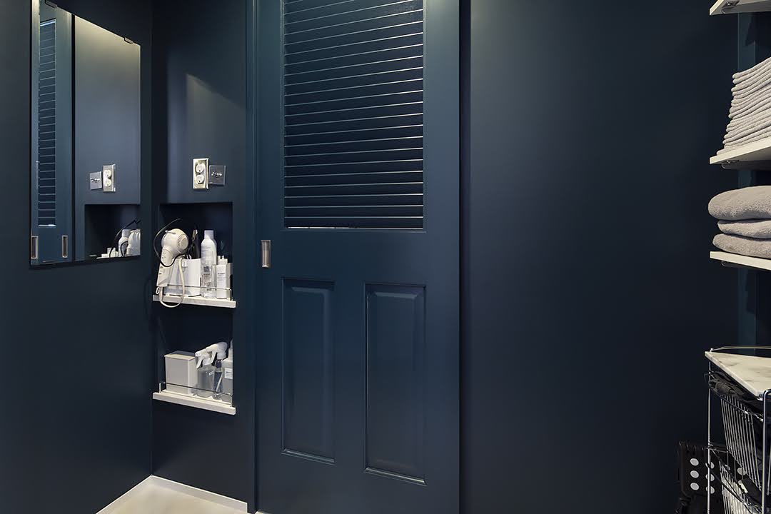 リビングはスクールハウスホワイト(=白よりも少しくすんだ風合いのある、イギリスの校舎をモチーフにした色)やグレーを配色していきましたが、あえて狭い部屋の脱衣所だけはヘイグブルーで埋め尽くしました。浴室の扉はガラス張りなので、深海や深い森をイメージさせる色を、お風呂に浸かりながらも感じられるアイデアです。