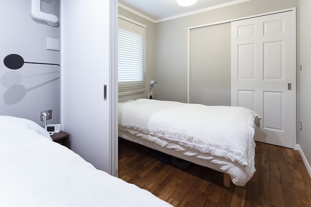 もう一つ特徴的なのが、寝室です。一緒に暮らしてきた時間の長いご夫婦でも、朝起きる時間が違う、エアコンの温度設定が違う等、それぞれの生活スタイルを曲げたくないのが正直なところ。ご夫婦ともに暮らしやすいように、ベッドの間に引き戸を設置し、必要な時は個室に仕切ることができるようにしました。朝起きるのが早い旦那様は、朝日を浴びられるように窓のある廊下側のベッドを使われています。エアコンの効きを調節するために引き戸を足元だけ空けておいたり、熱が出てしまったときは個室にしたりと臨機応変に。何かあったとき、お互いに声をかけやすいのも引き戸の良いところです。