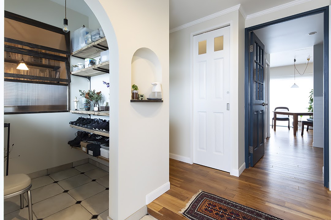 玄関土間のタイルは、なかなかお部屋のテイストに合う目当てのものが見つからず、オリジナルで施工することに。素朴な風合いの陶磁器タイルにカット加工を施し、オクタゴンにして貼ったデザインです。リズム感のあるアーチ型の入り口とニッチ、造作窓など、こだわりが詰まった玄関土間。実は、奥様が一番気に入っている場所だそうです。