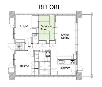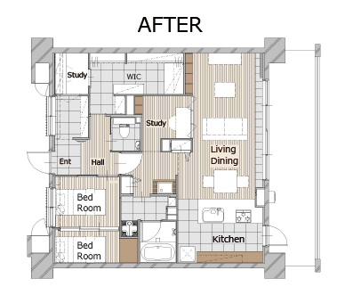 日本に戻ってきてから、国内で何回も引っ越しをされたというご夫婦ですが、リノベーションは今回が初めて。リノままのことは映画館で見かけたこともありご存知だったそうで、「映画会社のリノベーションは個性的なものができそうだと思った」と旦那様。お打合せでは、ご夫婦の好みを最大限盛り込んだプランニングを気に入っていただき、ご依頼くださりました。